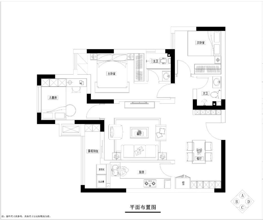 該房屋戶型面積較小,只有80m2,并且還是三室二廳,導(dǎo)致每間屋子的空間都較為局促。因此,進(jìn)行設(shè)計(jì)的時(shí)候,我們需要考慮到空間利用的問題,將有限的房屋面積充分利用起來。同時(shí)也要符合用戶的需求,在利用空間之余給兒童留下活動(dòng)的區(qū)域。