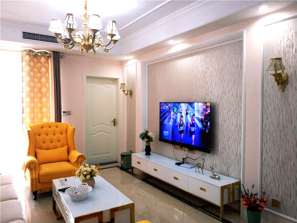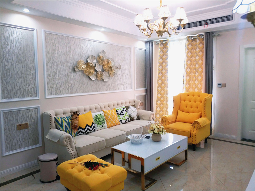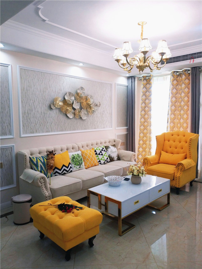 柔軟的布藝沙發(fā),是營造溫馨氛圍的不二之選。沙發(fā)的顏色選取了簡單的白色和明快的姜黃色,不經(jīng)意間流露出活潑的氣氛。金屬的墻面飾品與金屬銅色的燈具相得益彰,彎曲的弧度與圓環(huán)的形狀讓它們不會(huì)顯得過分生硬,而是在現(xiàn)代的氣氛中恰到好處地融入了一絲古典氣息。隨處可見的仿生花點(diǎn)綴了各個(gè)角落,為屋里增添了不少活力,更添溫暖與柔情。