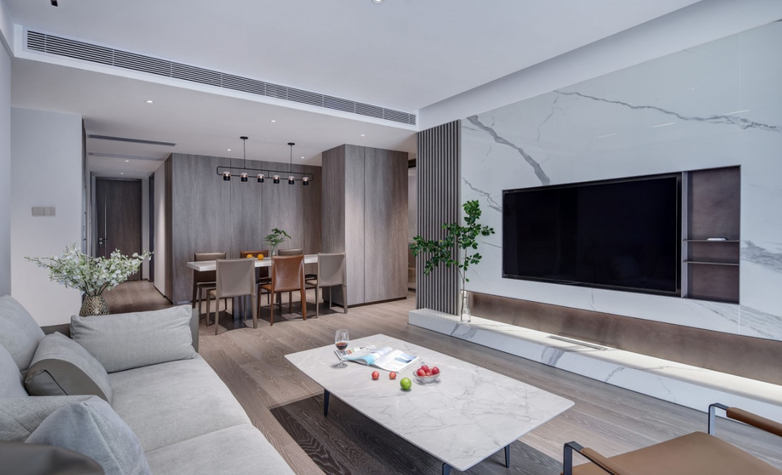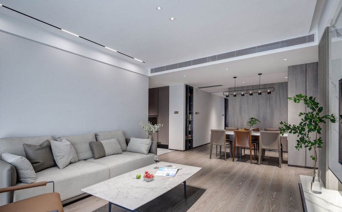 采用明亮而不眩目的無主燈設計,筒燈與磁吸燈簡約靈活的泛光照明,電視背景墻下隱藏燈帶的效果營造優化了空間形體以及局部的明暗關系