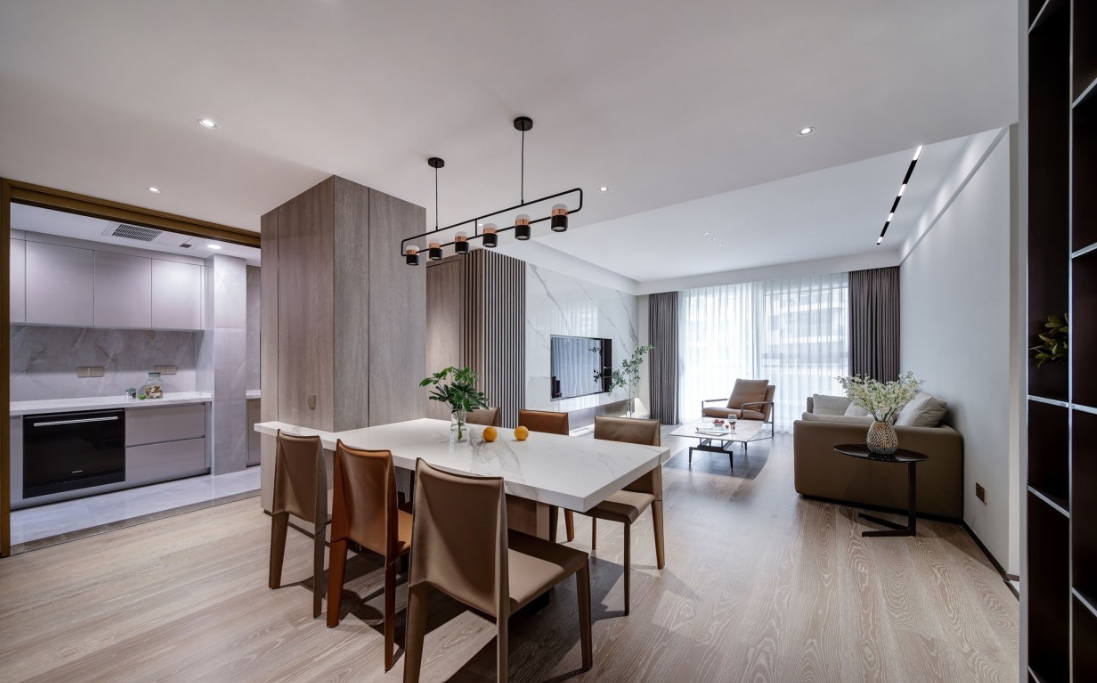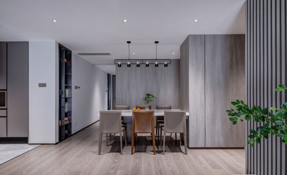餐廳承重柱是不少人會選擇回避的設計難點,設計師獨出心裁,將大理石桌面嵌入其內,遠遠望去,白色餐桌宛若浮空、靈動而輕盈,同時完美消解了承重柱礙眼的視覺效果