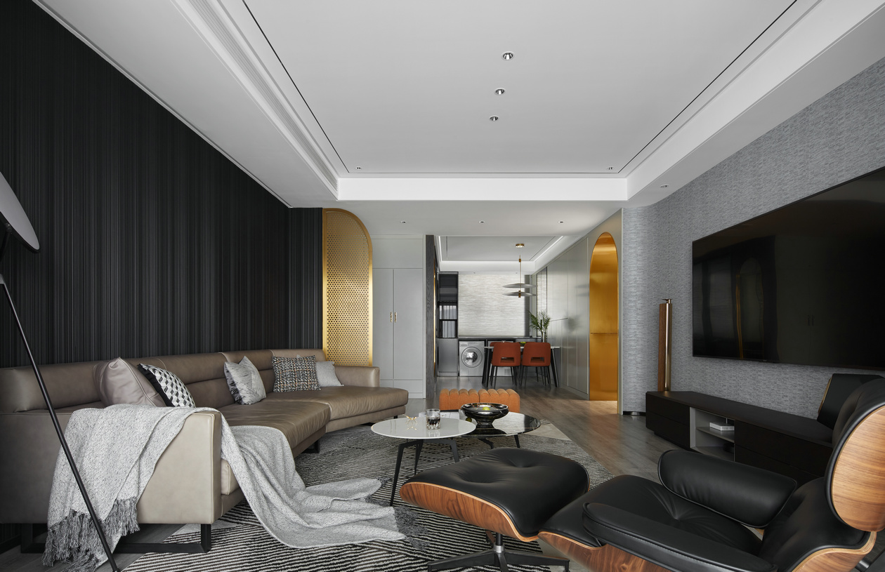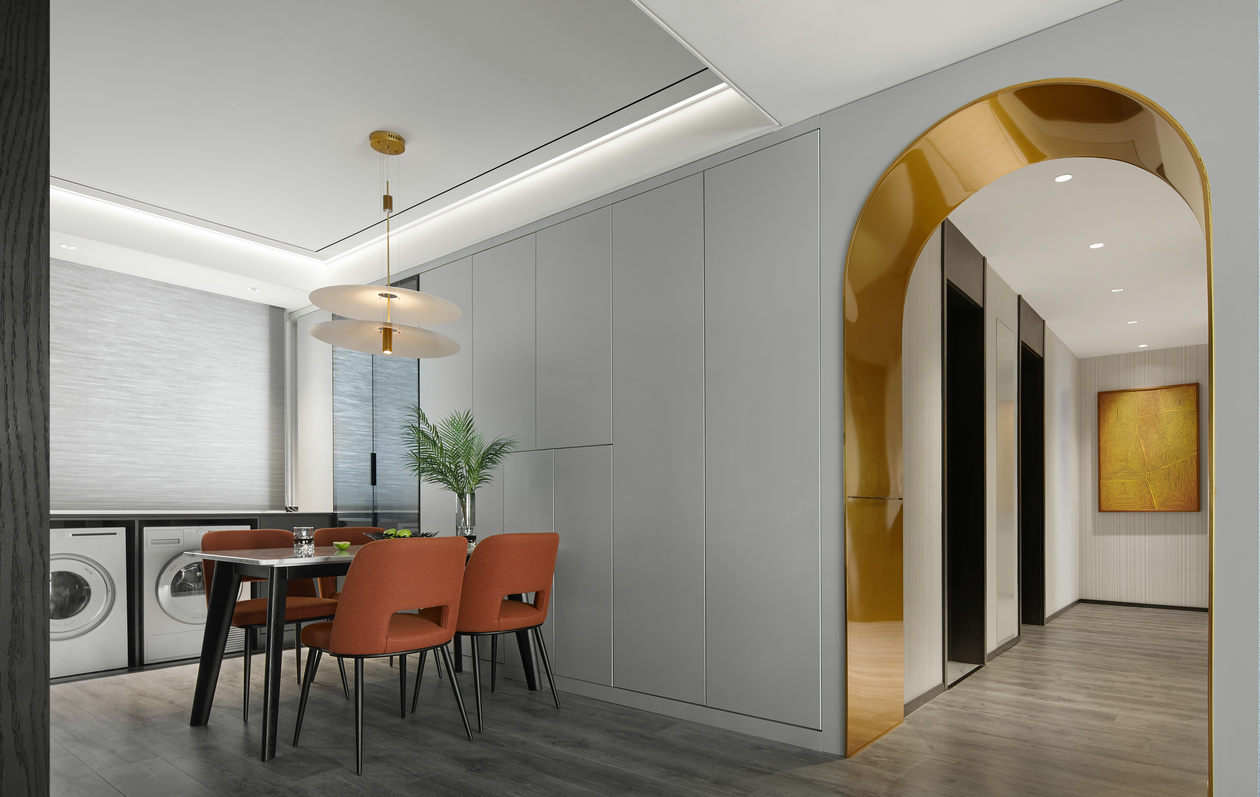 餐廳與客廳之間毫無(wú)阻隔,可以想象與好友們相聚用餐時(shí)的開(kāi)放與隨性,不拘泥于空間的功能性。金色的包邊線(xiàn)條與白色皮革組合,產(chǎn)生一種當(dāng)下潮流的時(shí)尚之美,同時(shí)透過(guò)色彩搭配,來(lái)增強(qiáng)空間的整體性。