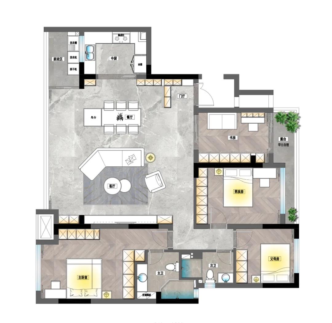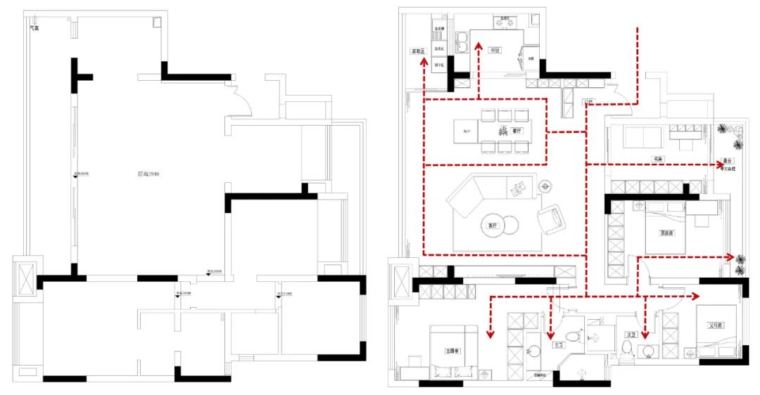 本案例中,常住人口是祖孫三輩5人,空間規劃上,客戶有比較大的收納需求。在充分了解客戶喜愛的設計風格與需求后,設計師結合實際戶型,將一個輕奢又溫柔的家居空間呈現在我們面前。