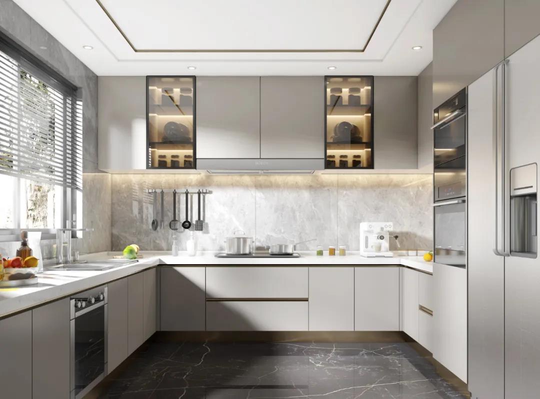 廚房主色調采用灰白色,讓空間看起來更加干凈溫柔。吸頂式的抽油煙機相較傳統油煙機來說造型更為流暢,智能化烹飪設備齊全,滿足客戶一家的多樣化烹飪需求。