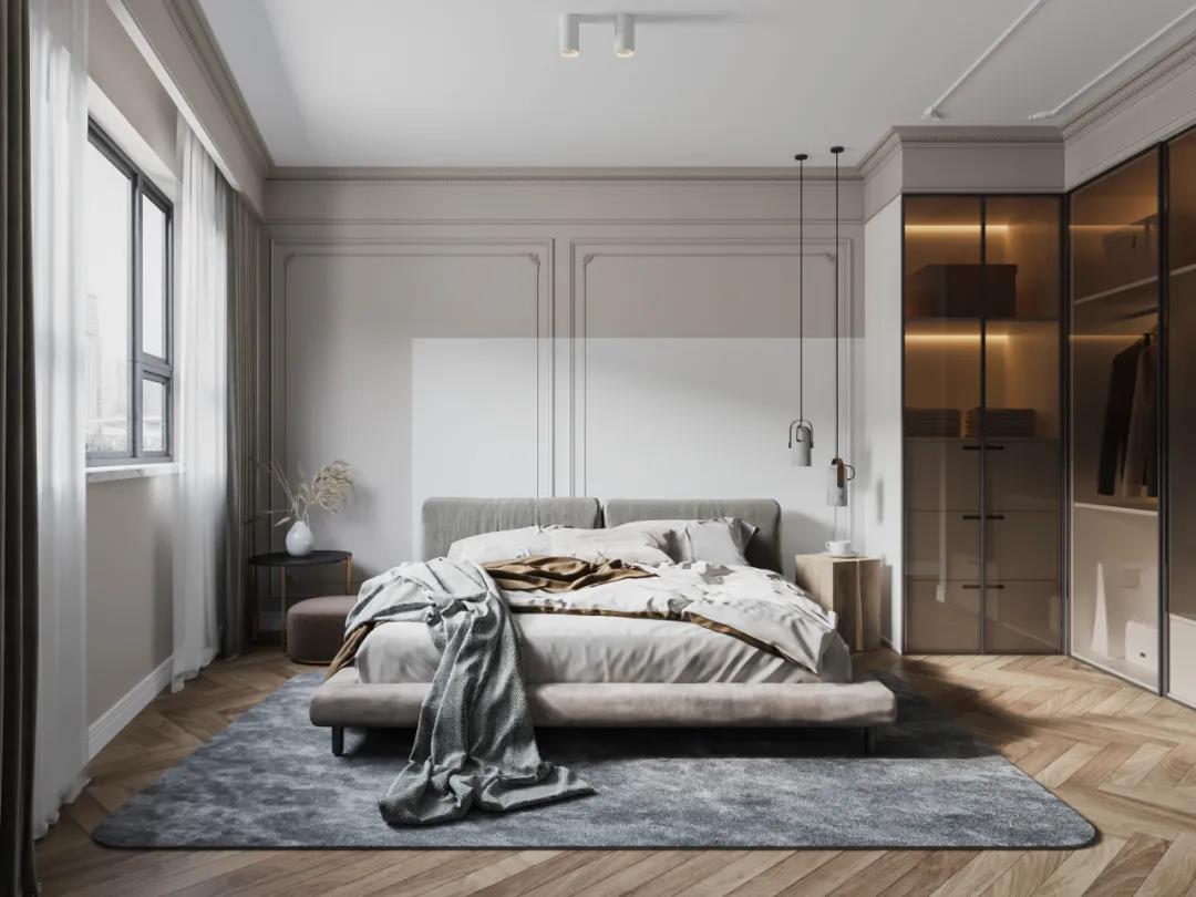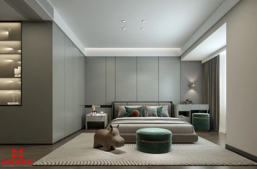 主臥的無主燈設計光源柔和,墻體使用低飽和度的灰綠色,再搭配米色和白色,挑選優雅、高貴的輕奢風深綠色家具,精心營造出溫柔繾綣之感。
