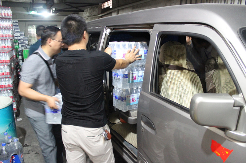 風塵仆仆,慰問成員扛著水向隆鑫天雨方進發
