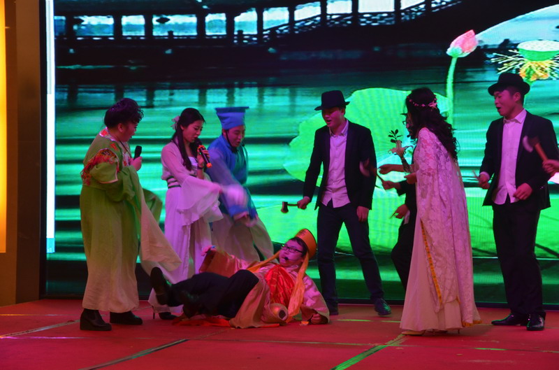 接下來的節(jié)目演出立刻讓晚會(huì)現(xiàn)場(chǎng)成為歡樂的殿堂。歌曲、舞蹈、小品、合唱多種節(jié)目形式,精彩紛呈,所有節(jié)目均為公司員工自編、自導(dǎo)、自演,充分反映出新思路裝飾生動(dòng)而富有內(nèi)涵的企業(yè)文化。繽彩紛呈、風(fēng)格各異的十幾個(gè)節(jié)目贏得觀眾滿堂喝彩,充分展現(xiàn)出新思路家人多才多藝、能歌善舞的一面。熱鬧喜慶的《拜新年》作為開場(chǎng)第一個(gè)節(jié)目閃亮登場(chǎng),歡快的舞蹈、喜慶的旋律、愉悅的氛圍感染著每一位在場(chǎng)的觀眾,為整場(chǎng)晚會(huì)點(diǎn)燃激情。活力奔放的串燒舞蹈《小蘋果》引起現(xiàn)場(chǎng)尖叫聲不斷;工程部家人帶來的歌曲《超越夢(mèng)想》以大合唱的形式唱響了新思路人超越夢(mèng)想、勇攀高峰的激情和心聲;性感柔美的歌伴舞《萬水千山總是情》更是引得場(chǎng)下“粉絲”陣陣尖叫。要說全場(chǎng)最閃亮的舞蹈,當(dāng)屬才女徐藝丹帶來的獨(dú)舞《映山紅》,優(yōu)美的舞姿訴說著無盡的情思,散發(fā)著醉人的芳香,看得人是如癡如醉。而江北店家人帶來的小品《招聘》延續(xù)去年的爆笑風(fēng)格,幽默的臺(tái)詞,惟妙惟肖的模仿讓現(xiàn)場(chǎng)笑聲連連,掌聲不斷。還有南坪店家人表演的小品《新白娘子傳奇》、工程部家人帶來的情景劇《交房》、沙坪壩店家人帶來的對(duì)唱《有你有我》、江北店家人表演的相聲《回家》......家人們以業(yè)余的身份發(fā)揮出了專業(yè)演員的水平,把角色演繹得惟妙惟肖,讓人嘆為觀止。