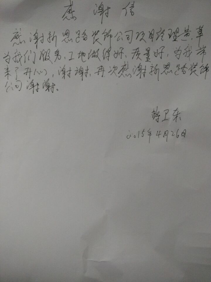 在信中,蔣老師表達了對新思路裝飾和黃工長的感謝之情:“感謝新思路裝飾公司,也感謝黃工長,工地做得好,服務好,為我帶來了開心,再次謝謝”!