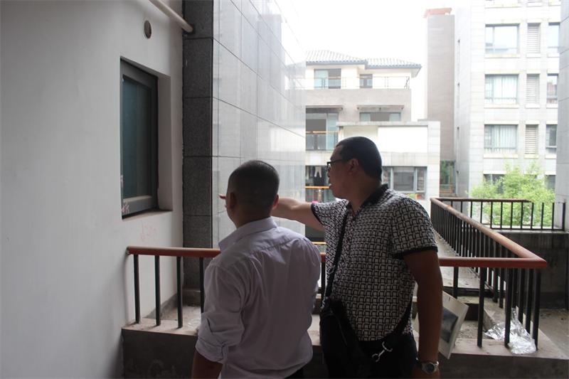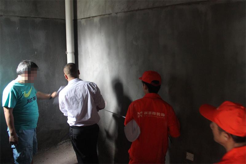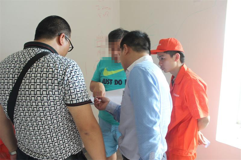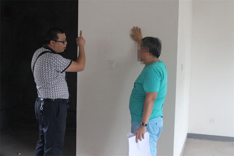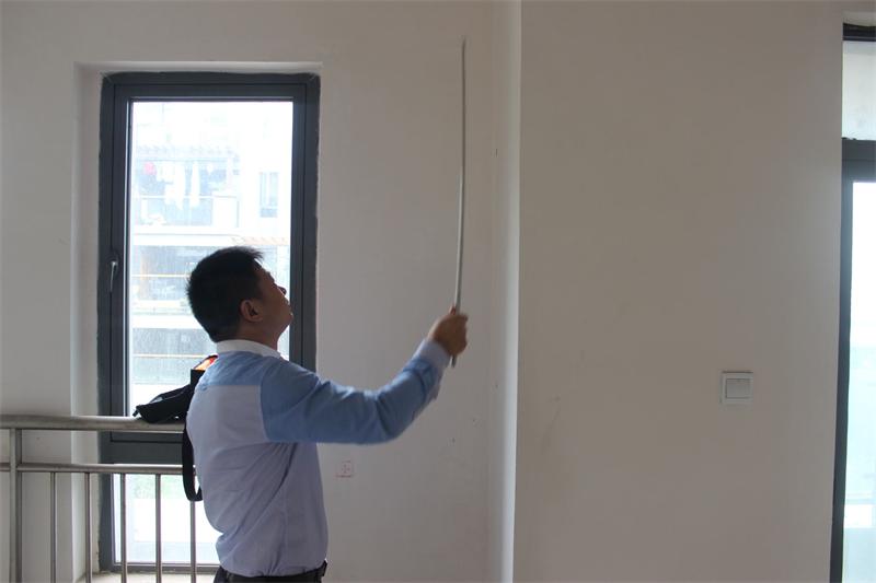 工程質檢正在認真檢查墻體是否存在空鼓情況。出現空鼓問題的,質檢會立即向物管反應,督促物管及時解決問題。
