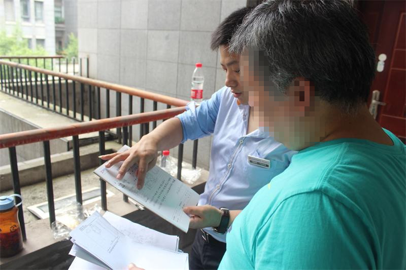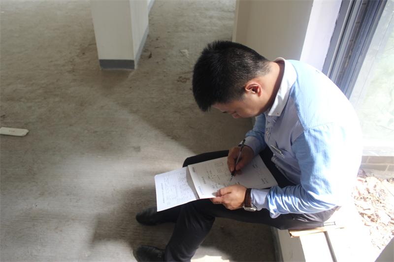 工程質檢正在認真填寫客戶服務手冊,以確認本次進場交底符合公司工程施工管理的相關規定。