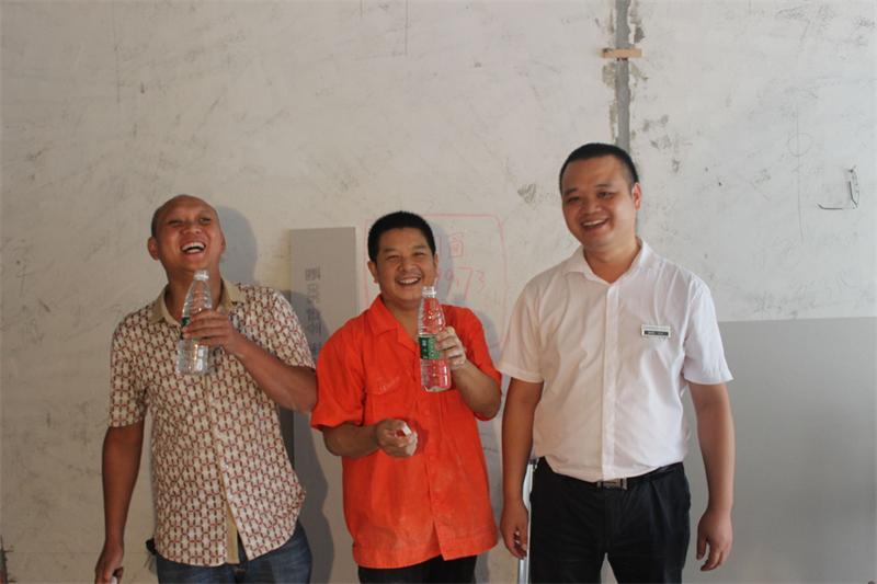 時下已是8月下旬,但山城氣溫依舊高居不下。炎炎夏日,驕陽似火,正是公司各施工工地趕工期、保品質的黃金時期。為了做好夏季防暑降溫工作,確保廣大一線員工的身心健康和安全,8月26日,新思路裝飾“2015夏季送清涼”活動正式啟動,以工程部、南坪店、北紅星店等部門組成的慰問小組,帶著藿香正氣水、礦泉水等防暑降溫物品,深入到工地施工一線,親切慰問在高溫下奮戰的工人師傅們,給他們送去了公司的關懷和絲絲清涼。
