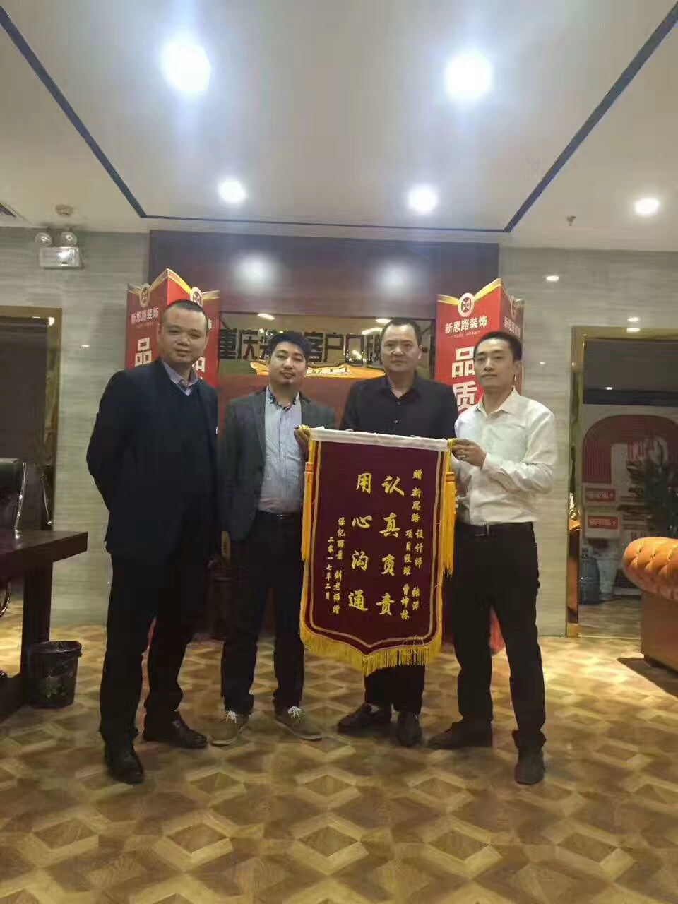 4月1日,來自保億麗景紫園的業主劉老師將一面印有“認真負責,用心溝通”的大紅錦旗交到渝北店雷店長手中,以感謝新思路裝飾高品質的裝修質量和服務水平。