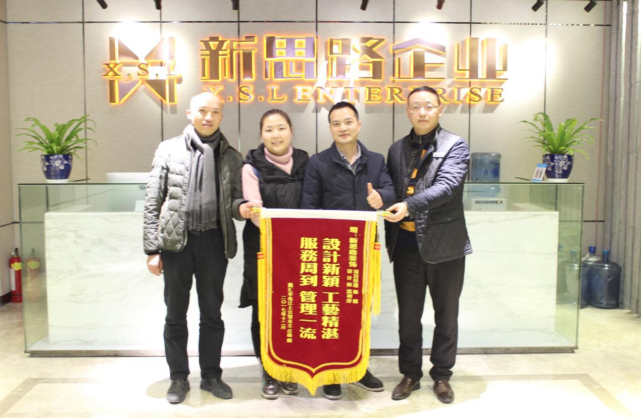 喜上眉梢——2018年的第一面錦旗 1月5日下午,來自融匯半島江上公館的業主夫婦莊老師和騰老師專程來到新思路裝飾南坪店,送上一面寫有“設計新穎、工藝精湛、、服務周到、管理一流”的大紅錦旗,以感謝新思路裝飾一流的設計方案和裝修質量。