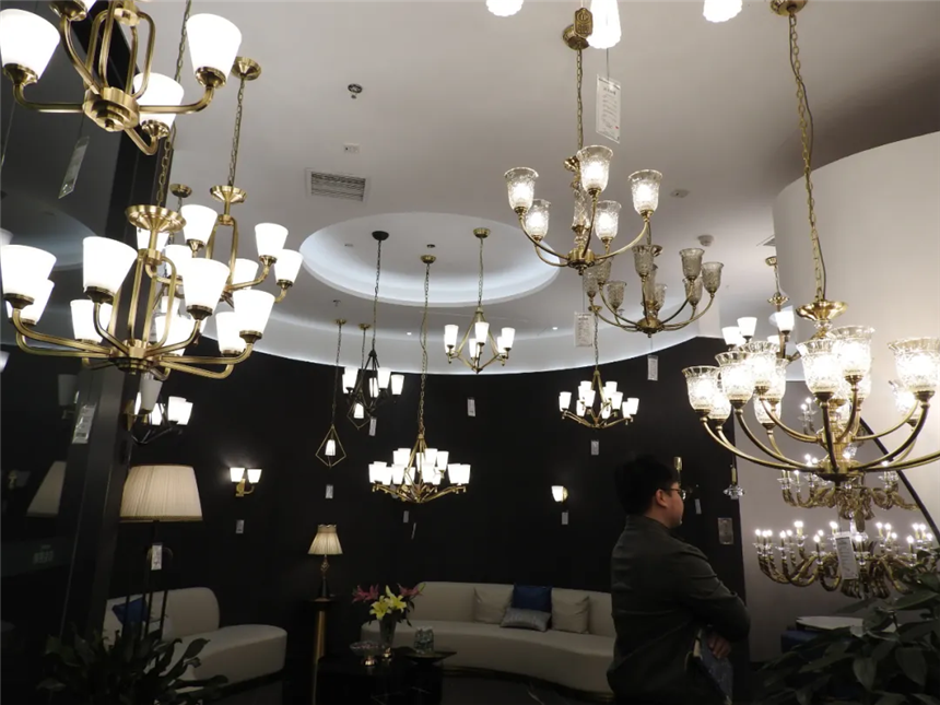 各種與歐式、美式風格適配的燈具,奢華無比。最后一盞燈被店員稱為“鎮店之寶”,全手工黃銅打造,價值人民幣三十余萬