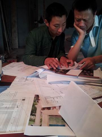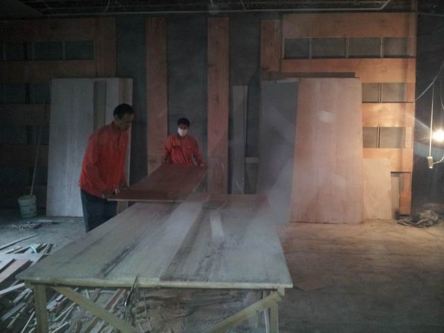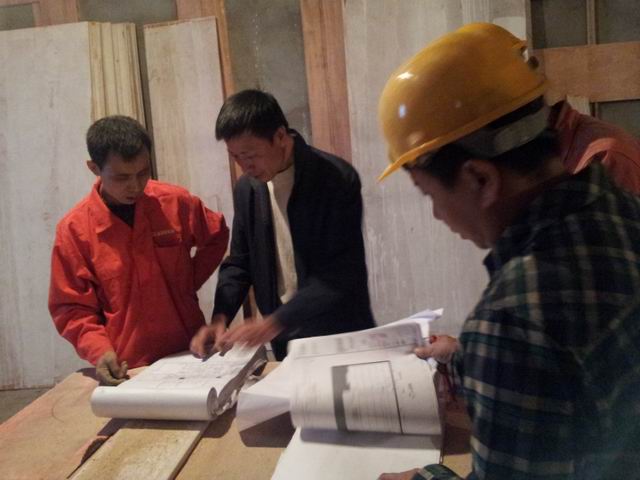 公裝部譚經(jīng)理正在和電工班組和木工班組討論施工細(xì)節(jié)