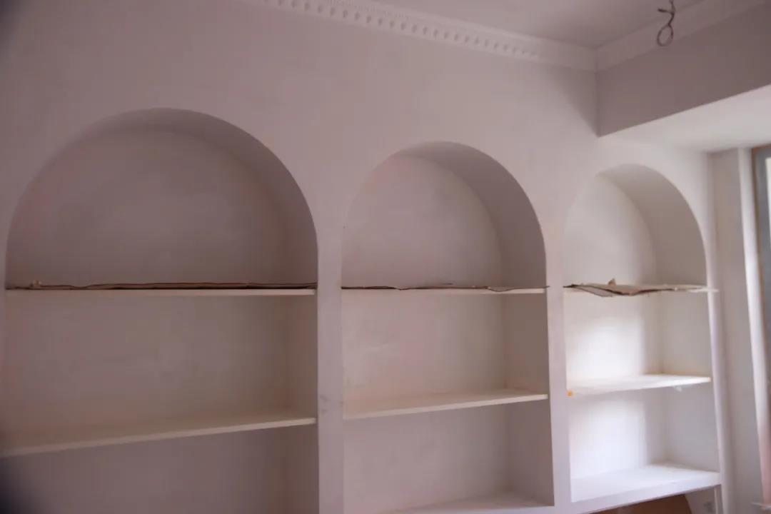 第三個工地正在硬裝進行中。這套案例設計上的巧思和花樣比較多,類似浮雕的花紋已經做好造型,等待燈具的安裝;衛生間的墻面也完成了,如同馬賽克的六邊形花紋拼貼低調中透露出一絲藝術性,拱門般的柜架設計還帶來不少別樣風情。相信在不久之后,這里會是客戶溫暖而美麗的家。